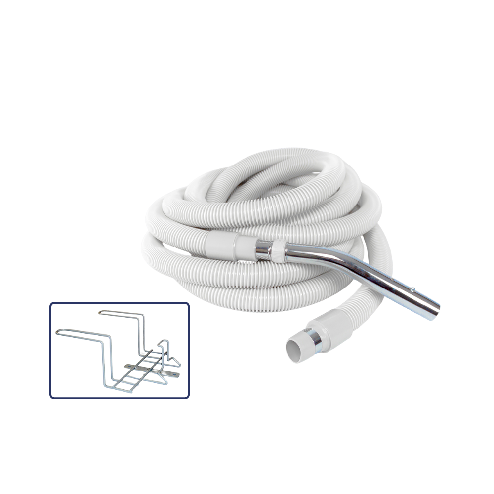 The Ultralite Hose is an economical, simple, and lightweight central vacuum hose mostly used in unfinished areas of the home, such as a garage or an unfinished basement. Minus an on/off switch, this hose turns on the vacuum system when it is plugged directly into the wall inlet valve. An air-relief valve allows you to reduce the suction for cleaning things like blinds, curtains or other applications where you need less suction. It has a button-lock style handle, and a hose rack is included so you have a convenient way to hang up and store your hose when not in use. This hose will also work with Vacuflo inlets that turn on automatically when you open the inlet flap door. 50 ft in length, this is the standard-sized hose and comes packaged with a heavy-duty wire hose hanging rack.